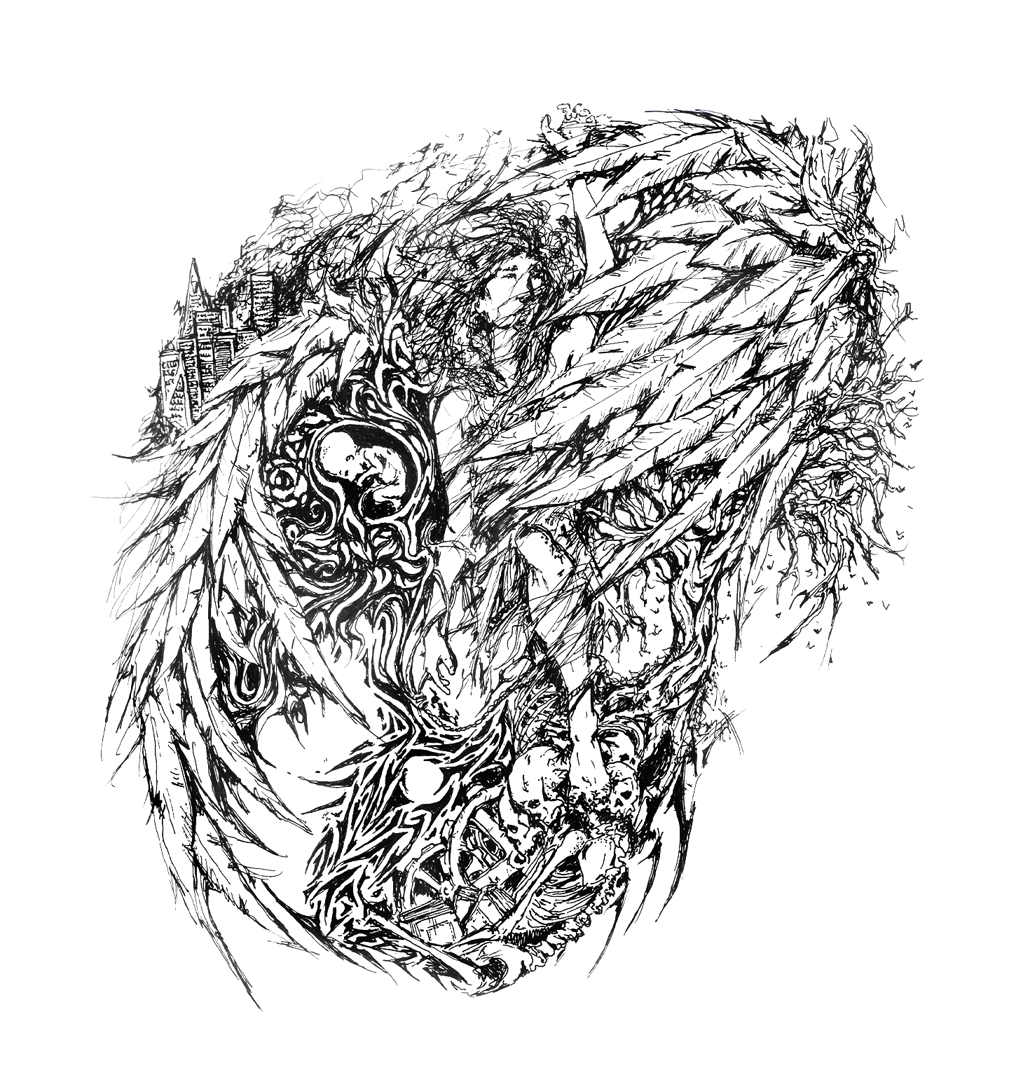 The fetus was one of the first images that came to my mind, and I built everything else around it, improvising from that starting point. It symbolized the beginning of life — where the umbilical cord transforms into flowers and leaves. The child rests safely, protected under a wing. Nature itself will do anything to ensure this life is born and continues to grow.